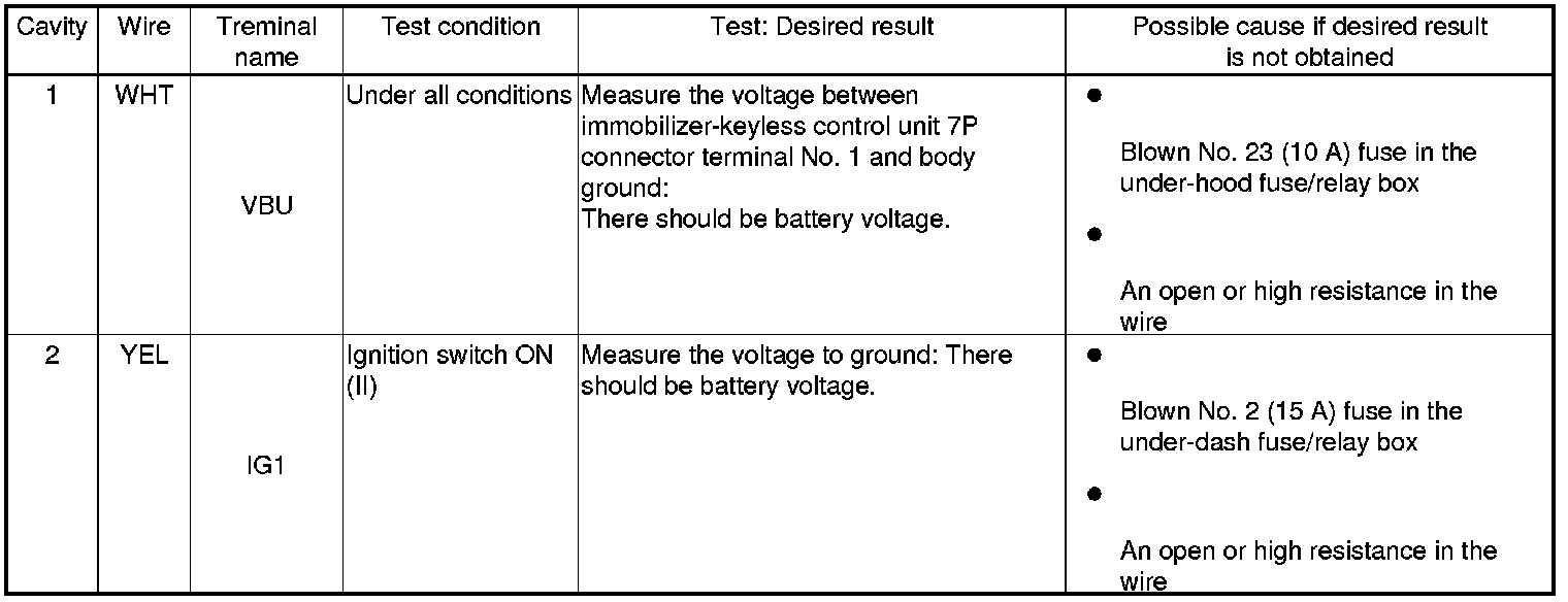 6. Reconnect the connectors to the immobilizer-keyless control unit, and do the following input tests: