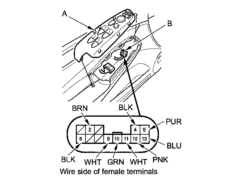 1. 4-door: Remove the power window master switch panel (A) and 13P connector (B).