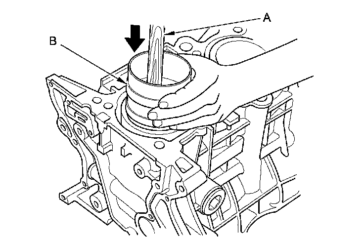 Push down on the ring compressor (B) to prevent the rings from expanding before entering the cylinder bore.