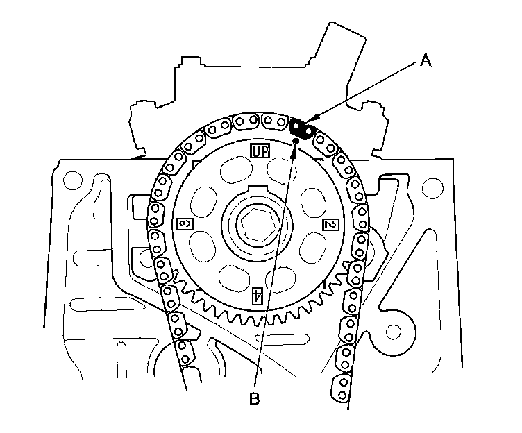 3. Install the cam chain on the crankshaft sprocket with the colored piece (A) aligned with the mark (B) on the crankshaft sprocket.