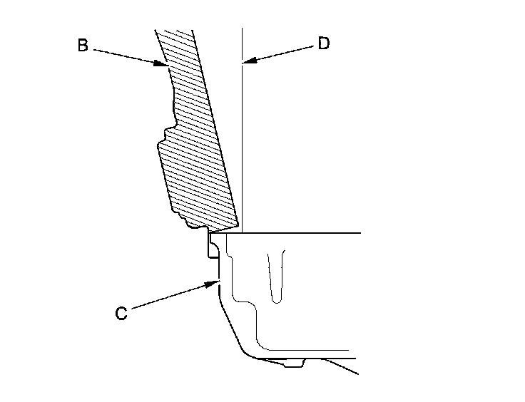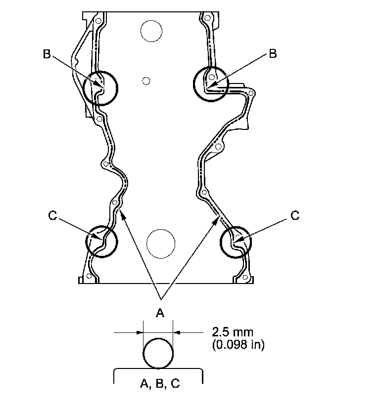 - Apply a 2.5 mm (0.098 in) diameter bead of liquid gasket along the broken line (A), (B), and (C).