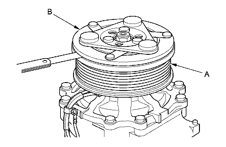 3. Measure the clearance between the rotor pulley (A) and the armature plate (B) all the way around. If the clearance is not within specified limits, remove the armature plate Service and Repair and add or remove shims as needed to increase or decrease clearance.