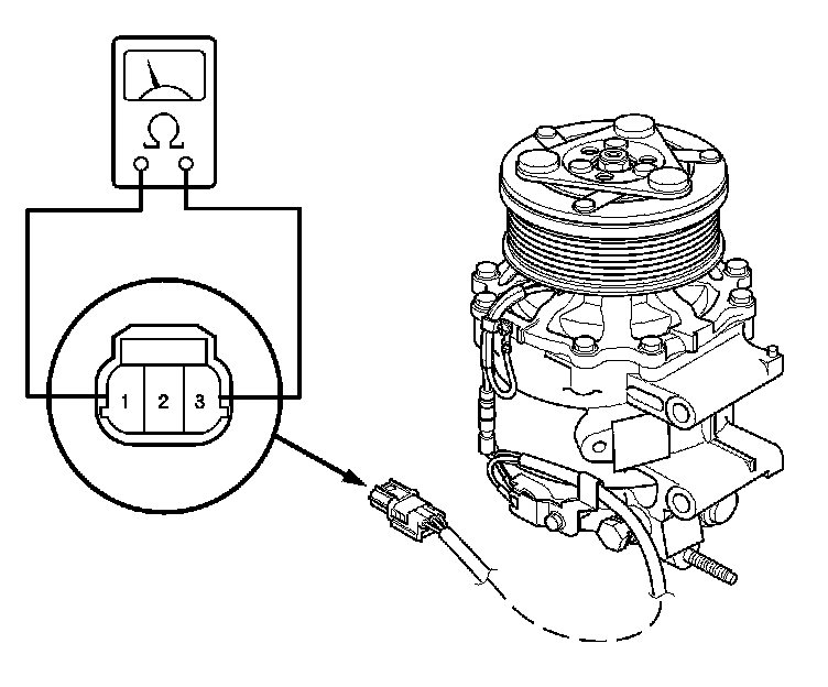 4. Check for continuity between the A/C compressor clutch connector terminals No. 1 and No. 3. If there is no continuity, replace the thermal protector A/C Compressor Thermal Protector Replacement.