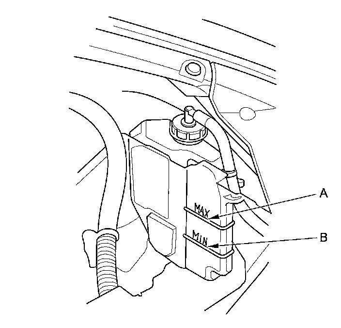 1. Check at the coolant level in the coolant reservoir. Make sure it is between the MAX mark (A) and MIN mark (B).