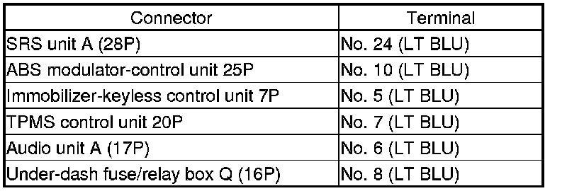 Repair short in the wire between the DLC (K-line) and the ABS modulator-control unit, the SRS unit, the immobilizer-keyless control unit, the TPMS control unit, the audio unit, or the under-dash fuse/relay box.�