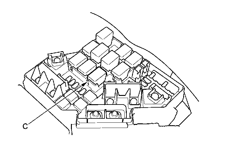 38. Remove PGM-FI main relay 1 (C) from the under-hood fuse/relay box.
