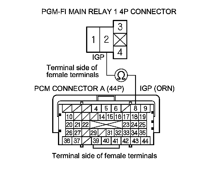 42. Check for continuity between PGM-FI main relay 1 4P connector terminal No. 2 and body ground.