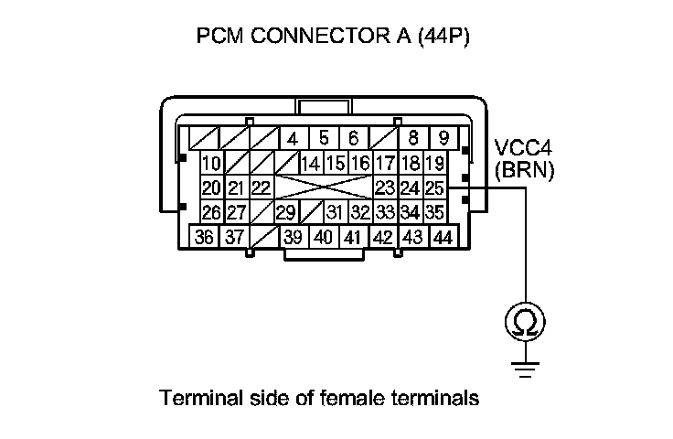 75. Check for continuity between PCM connector terminal A25 and body ground.