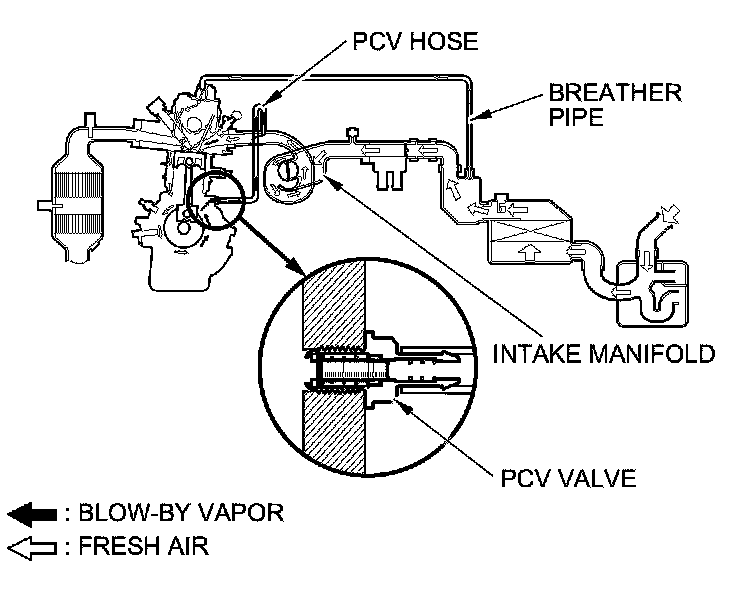 The PCV valve prevents blow-by gasses from escaping into the atmosphere by venting them into the intake manifold.