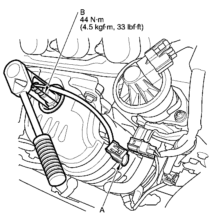 1. Disconnect the A/F sensor 4P connector (A), then remove the A/F sensor (B).