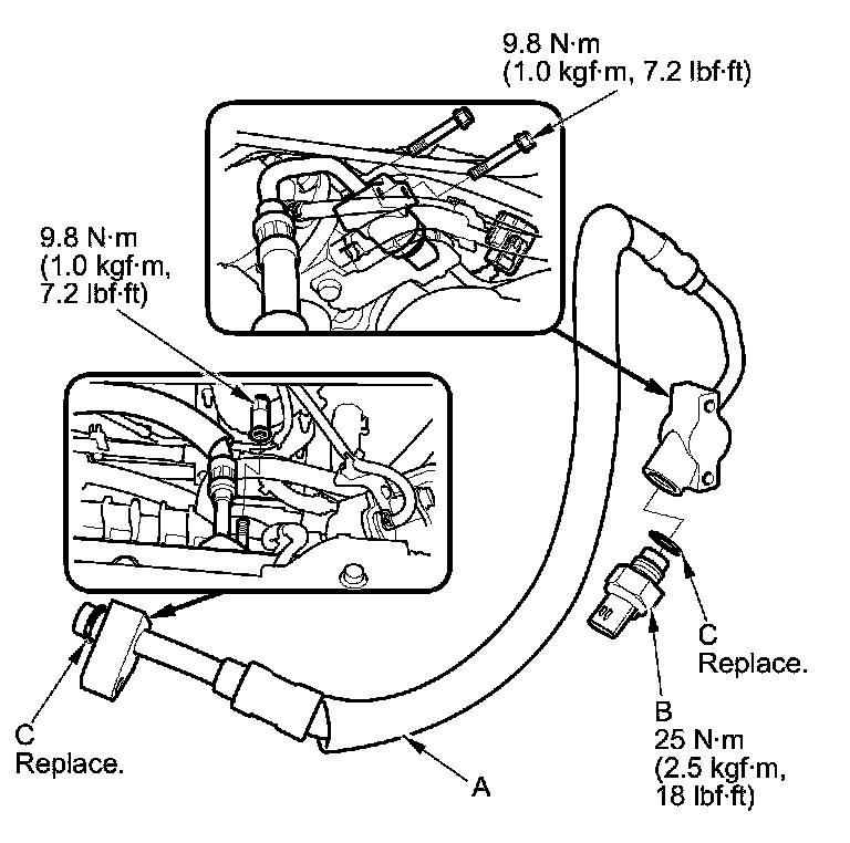 5. Apply silicone oil or polyalkyleneglycol (PAG) oil to the new O-rings (C), and carefully install them into their proper positions Service and Repair.