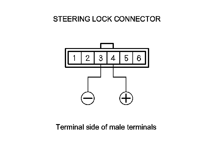 4. Connect power to steering lock connector terminal No. 4, and ground to steering lock connector terminal to No. 3. Check that the ignition key cannot be turned to LOCK (0) position. Disconnect power, and check that the key can be turned to LOCK (0) position and removed from the cylinder.