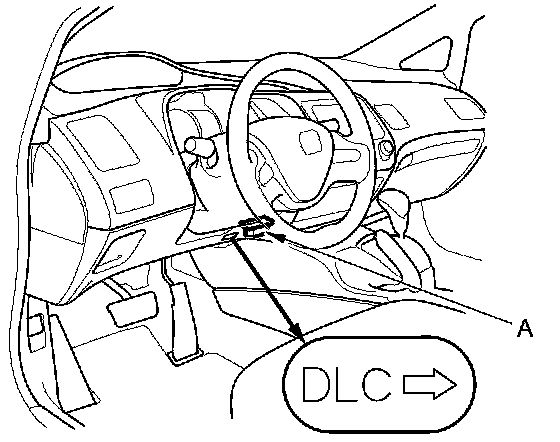 When the Honda Diagnostic System (HDS) is connected to the data link connector (DLC) (A) located under the driver's side of the dashboard, and when the ignition switch is turned to ON (II) and the appropriate menu is selected, it will indicate the diagnostic trouble code (DTC).
