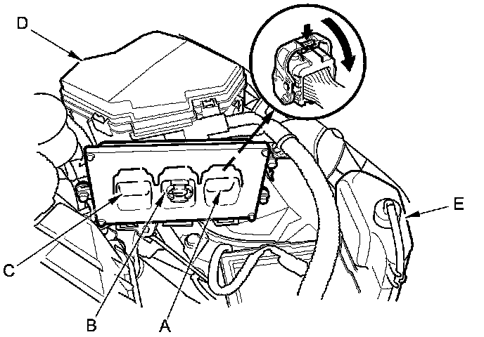 4. Remove the coolant reservoir (E). Disconnect PCM connectors A, B, and C.