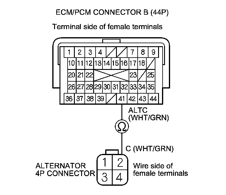 13. Check for loose terminals and connectors, then check for continuity between ECM/PCM connector terminal B41 and alternator 4P connector terminal No. 2.