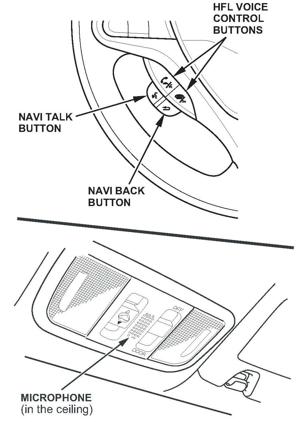 NAVI TALK button - Press and release this button to activate the voice control system. After pressing and releasing NAVI TALK, wait for the beep, then speak your command.