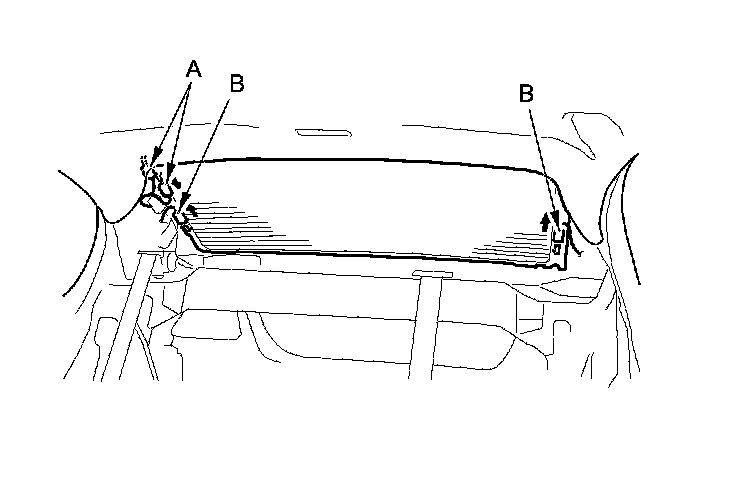2. Disconnect the window antenna terminals (A) and the rear window defogger terminals (B).