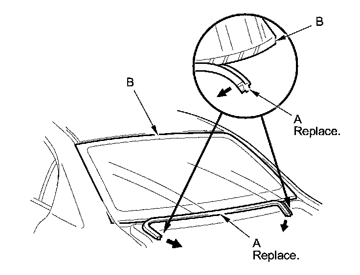 6. Remove the lower rubber dam (A) from the lower edge of the rear window (B). If necessary, cut the molding with a utility knife.