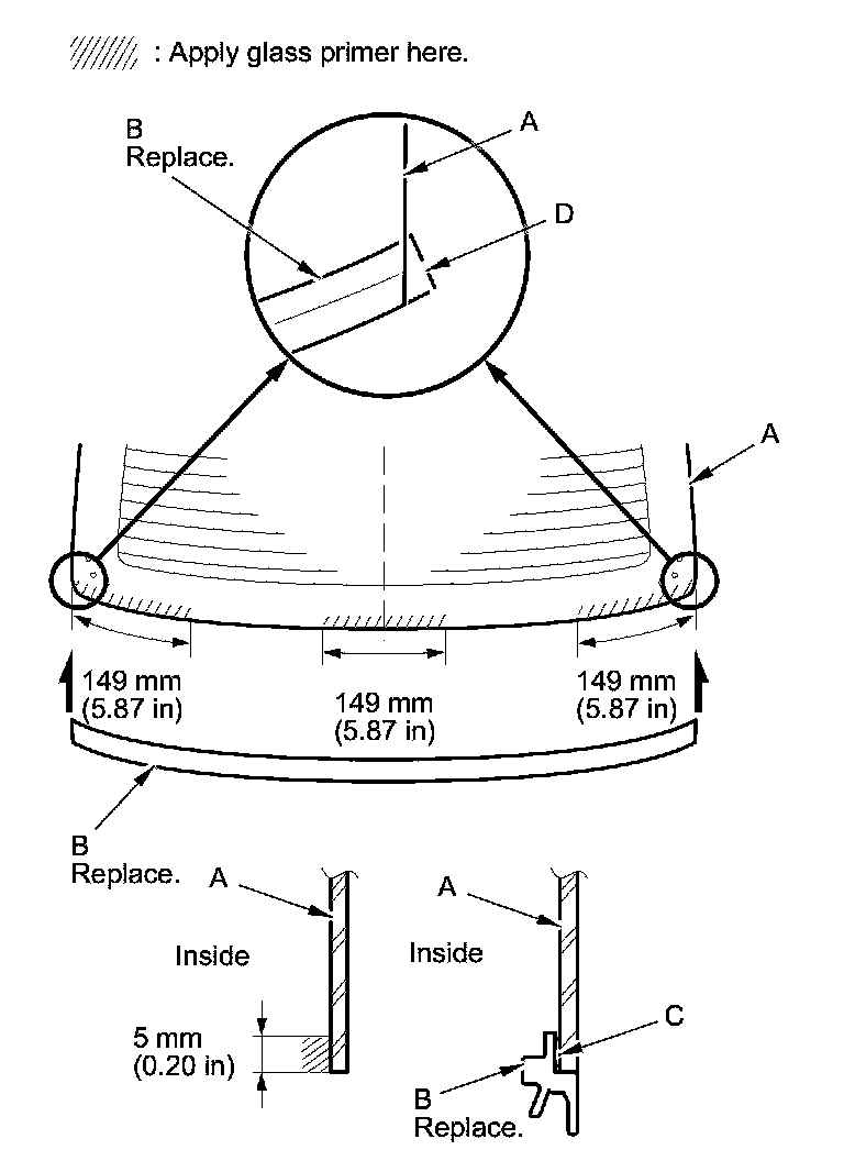 - Apply the glass primer to the corner areas of the rear window using the printed dots (D) on the rear window as a guide.