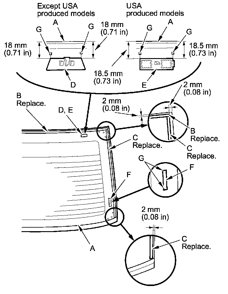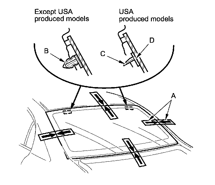 13. Apply glass primer to the upper clip mounting areas on the rear window (A), and let it dry. Attach the upper rubber dam (B), the side rubber dams (C), the clips (D) (except USA produced models), the upper fasteners (E) (USA produced models), and the side fasteners (F) with adhesive tape to the inside face of the rear window as shown:
