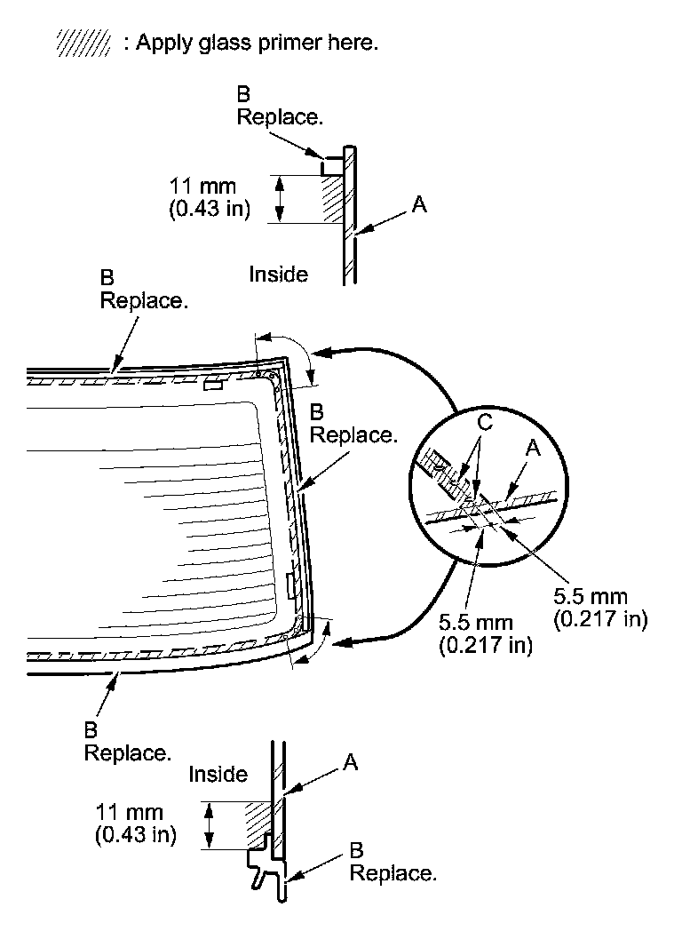 - Apply the glass primer to the corner areas of the rear window using the printed dots (C) on the rear window as a guide.