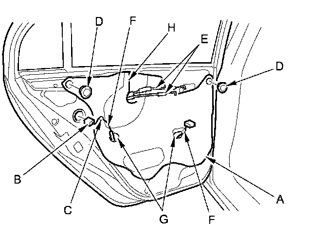 1. Disconnect the power door lock actuator connector (B), and detach the harness clip (C).