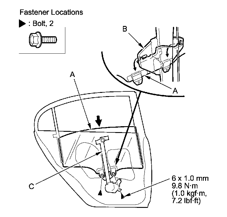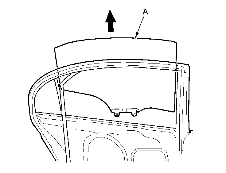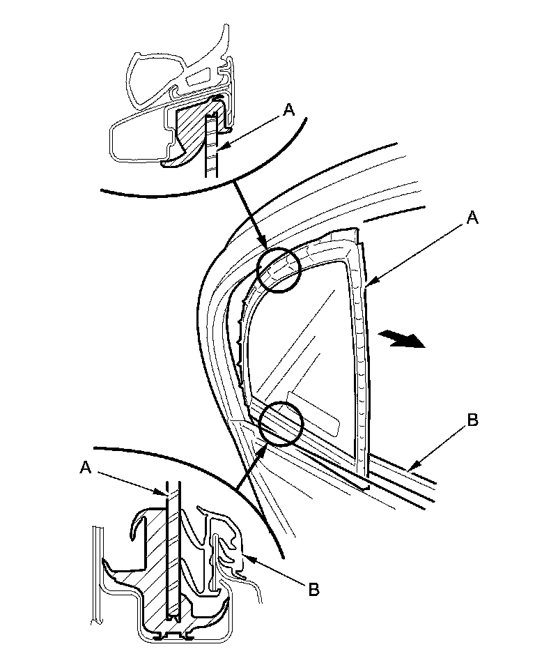 NOTE: Take care not to damage the door glass outer weatherstrip (B).