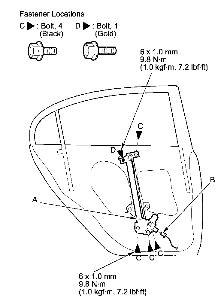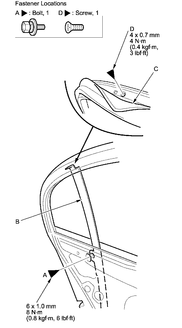 4. Remove the bolt (A) from the rear lower channel (B). Pull away the door weatherstrip (C) as needed, and remove the screw (D).