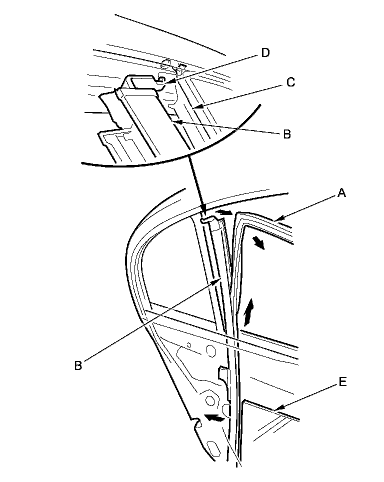 5. Pull away the glass run channel (A) as needed. Pull the rear lower channel (B) forward from the quarter glass seal (C), then release the upper hook (D) from the door. Remove the rear lower channel from the door glass (E), then pull up the channel to remove it.