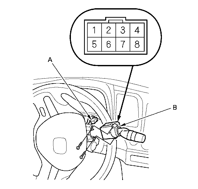 2. Disconnect the dashboard wire harness 8P connector (A) from the wiper/washer switch (B).
