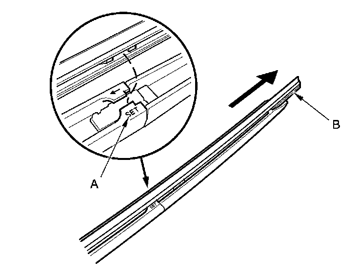 3. Press and hold the tab (B) and slide the wiper blade (C) toward the tabs until it releases from the wiper arm (D).