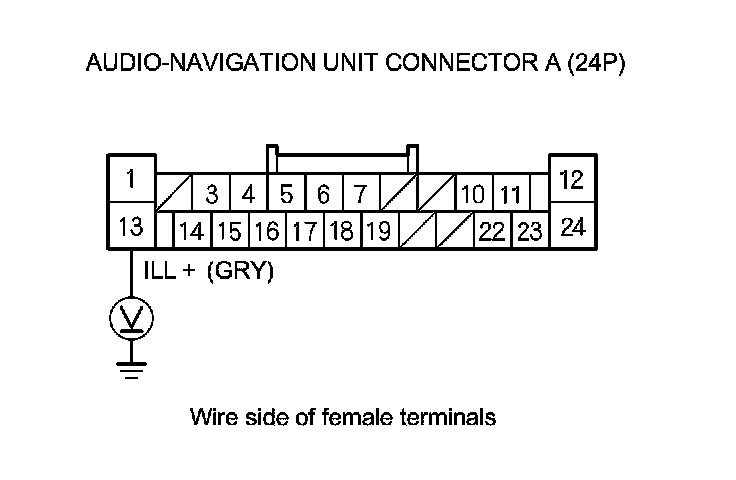 10. With the headlight switch still on, measure the voltage between audio-navigation unit connector A (24P) terminal No. 13 and body ground.