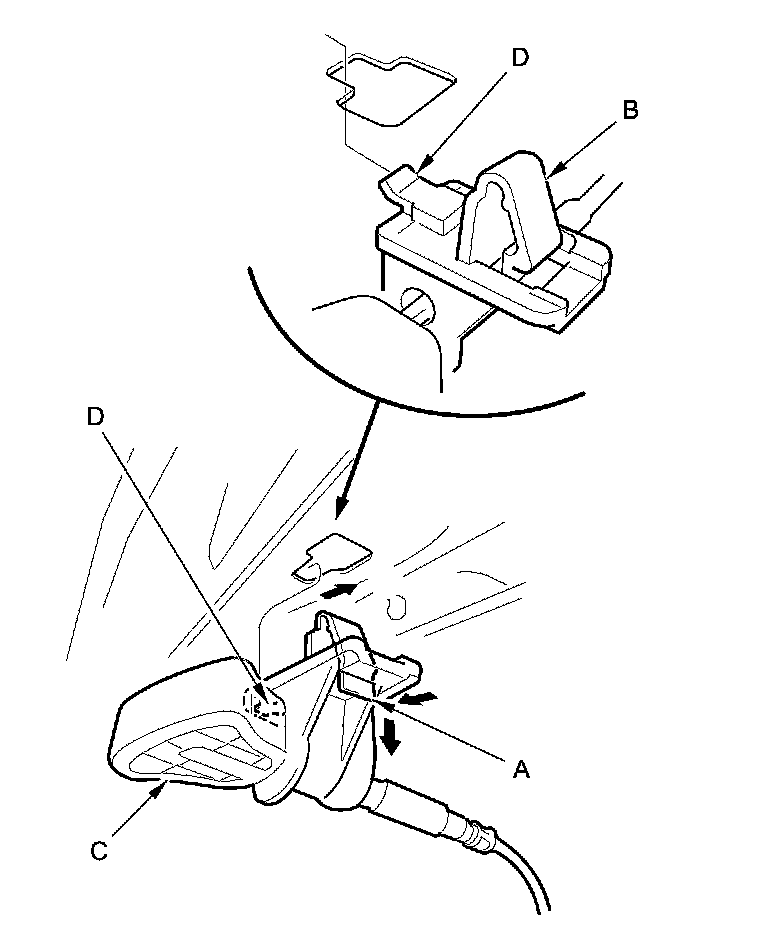 5. Push the tab (A) to release the hook (B), and rotate the seat-back release lever (C) clockwise to release the hook (D).