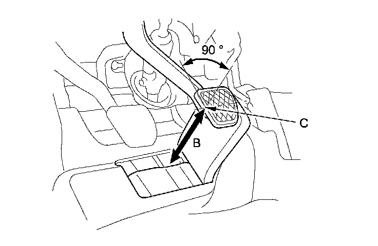 2. Pull back the carpet, and find the cutout in the insulation. Measure the pedal height (B) at the middle of the left side center of the pedal pad (C) to the floor without the insulation.