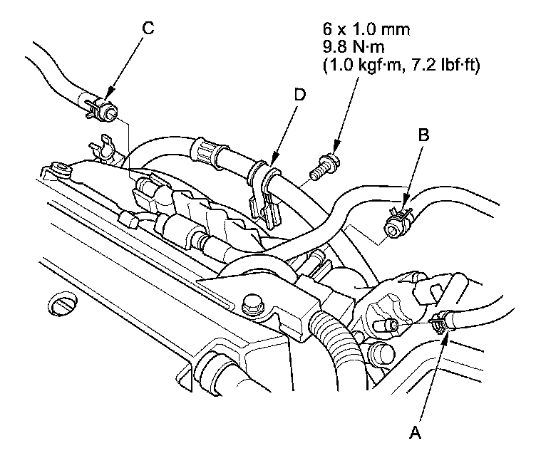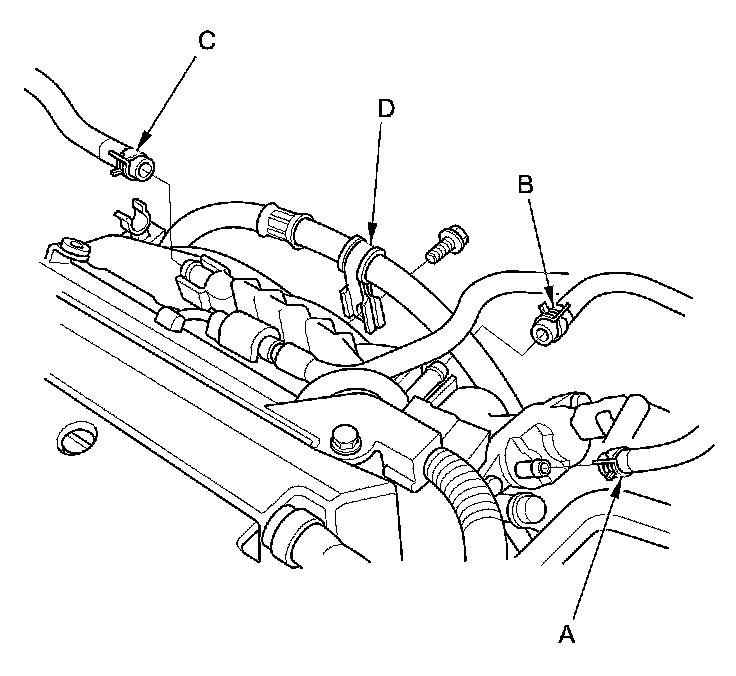 6. Disconnect the EVAP canister hose (A), the brake booster vacuum hose (B), and the PCV hose (C), and remove the power steering hose clamp (D).