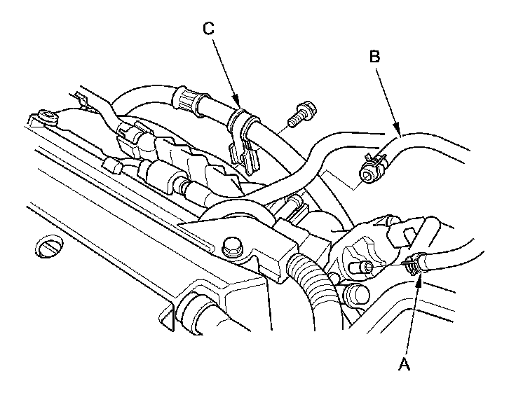 9. Disconnect the EVAP canister hose (A) and the brake booster vacuum hose (B), and remove the power steering hose clamp (C).
