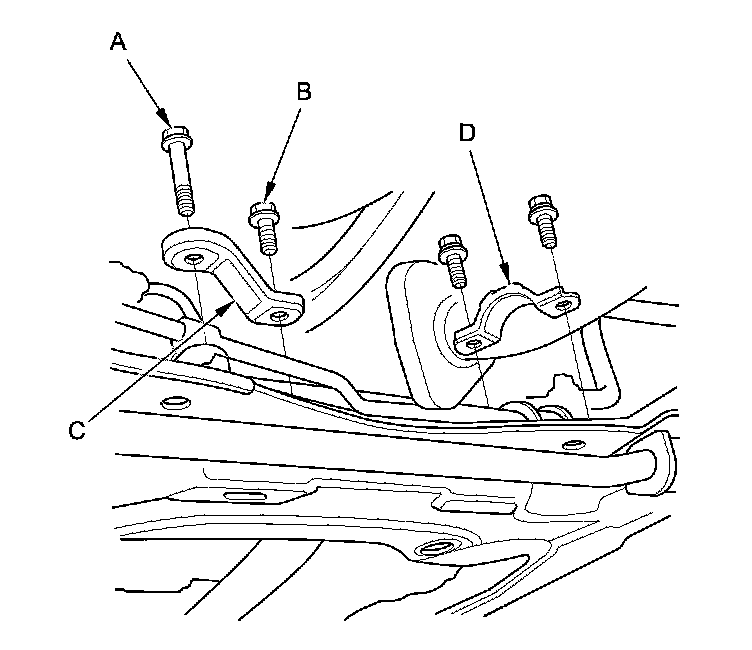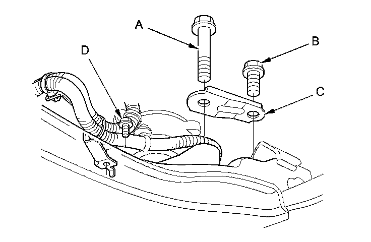 38. EPS model: Remove the steering gearbox mounting bolt (A), the stiffener mounting bolt (B), the stiffener (C), and the bolt (D) securing the harness clamp bracket.