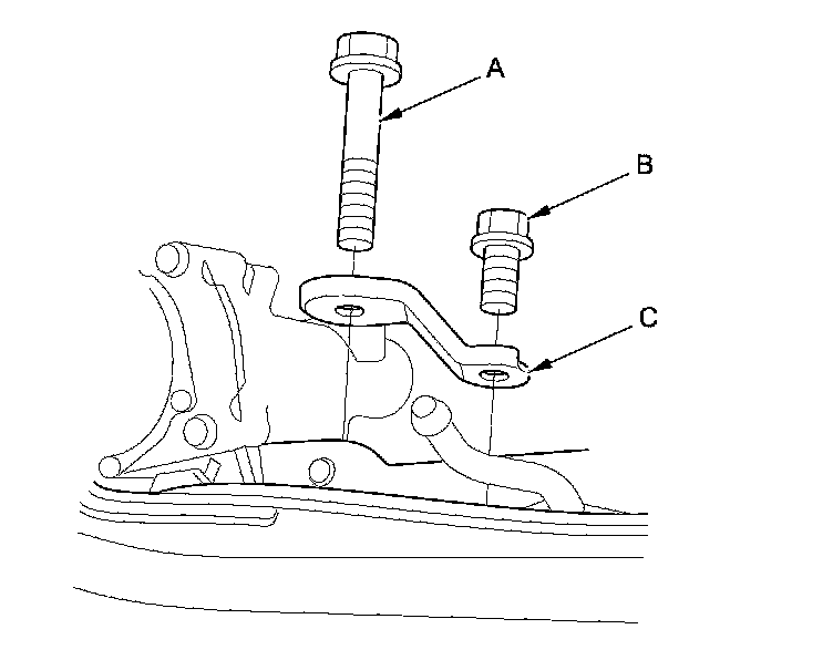 33. Hydraulic power steering model: Remove the steering gearbox mounting bolt (A), the stiffener mounting bolt (B), and the stiffener (C).