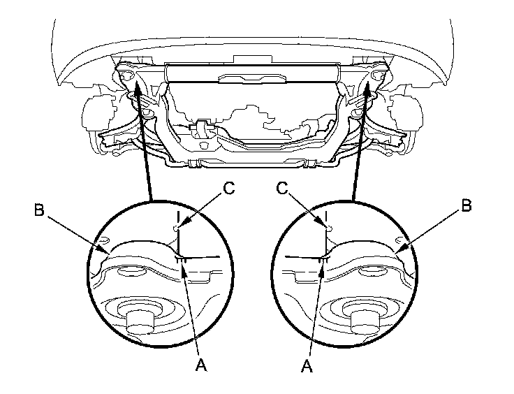 51. Make appropriate reference lines (A) at both sides of the front subframe (B) that line up with the edges (C) on the body.