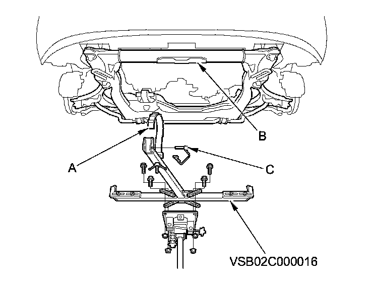 53. Attach the subframe adapter (VSB02C000016) to the front subframe by looping the belt (A) over the front of the front subframe (B), then secure the belt with its stop (C).