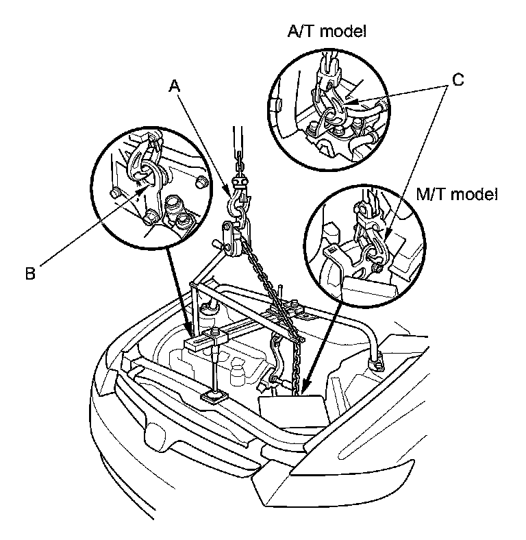 59. Attach a chain hoist (A) to the universal lifting eyelet (B) and the transmission hanger (C), then lift the engine/transmission until it is securely supported by the chain hoist, and remove the engine support hanger, the 2006 Civic engine hanger and the 1.8 support eyelet.