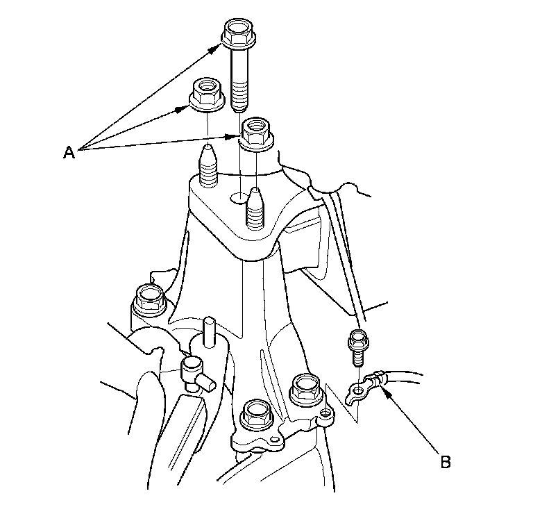 61. Remove the transmission mount bracket mounting bolt and the nuts (A).