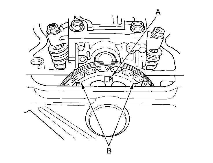 5. Set the No. 1 piston at top dead center (TDC). The "UP" mark (A) on the camshaft sprocket should be at the top, and the TDC grooves (B) on the camshaft sprocket should line up with the top edge of the head.
