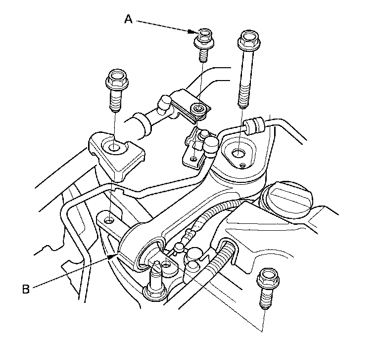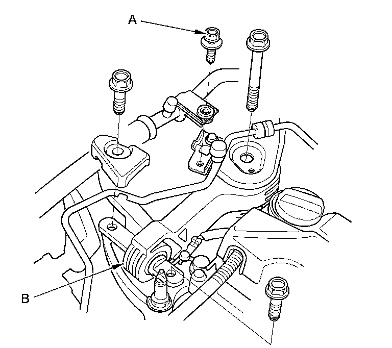 8. Remove the bolt (A) securing the A/C line, then remove the upper torque rod (B).