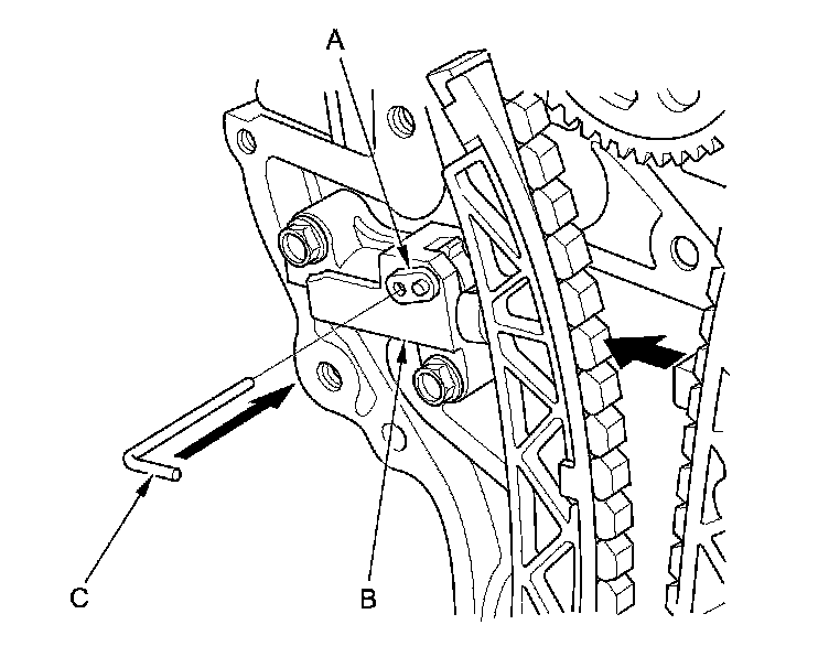 15. Rotate the crankshaft counterclockwise to align the holes on the lock (A) and the auto-tensioner (B), then insert a 1.0 mm (1/32 in) diameter pin (C) into the holes. Turn the crankshaft clockwise to secure the pin.