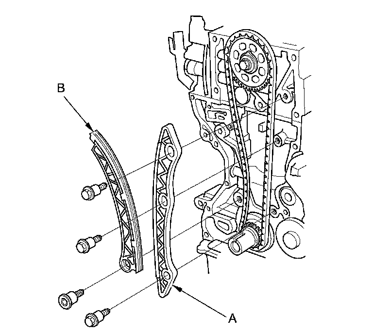 18. Remove the cam chain guide (A) and the cam chain tensioner arm (B).