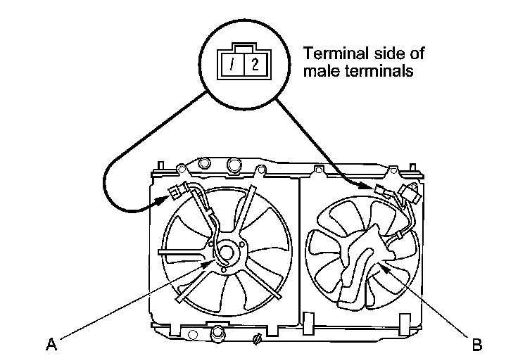 Disconnect the 2P connectors from the radiator fan motor (A) and the A/C condenser fan motor (B).