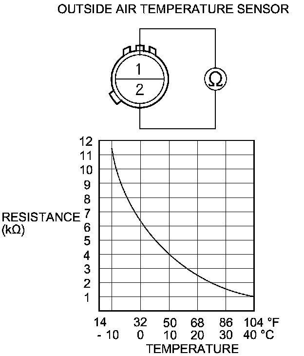 3. Compare the resistance reading between terminals No. 1 and No. 2 of the outside air temperature sensor with the specifications shown in the graph; the resistance should be within the specifications.