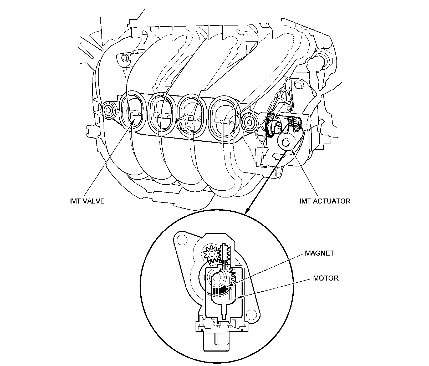 The intake manifold tuning (IMT) actuator contains a sensor that detects the IMT valve position and sends it to the ECM/PCM.