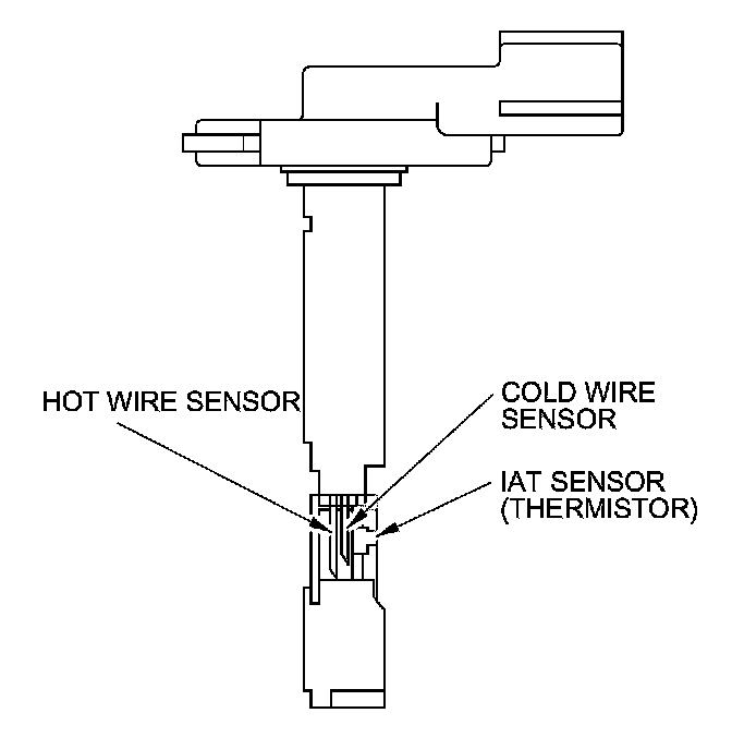 The mass air flow (MAF) sensor/intake air temperature (IAT) sensor contains a hot wire sensor, a cold wire sensor, and a thermistor. It is in the intake air passage. The resistance of the hot wire sensor, the cold wire sensor, and the thermistor changes due to intake air temperature and air flow. The control circuit in the MAF sensor controls the current to keep the hot wire at a set temperature. The current is converted to voltage in the control circuit, then output to the ECM/PCM.